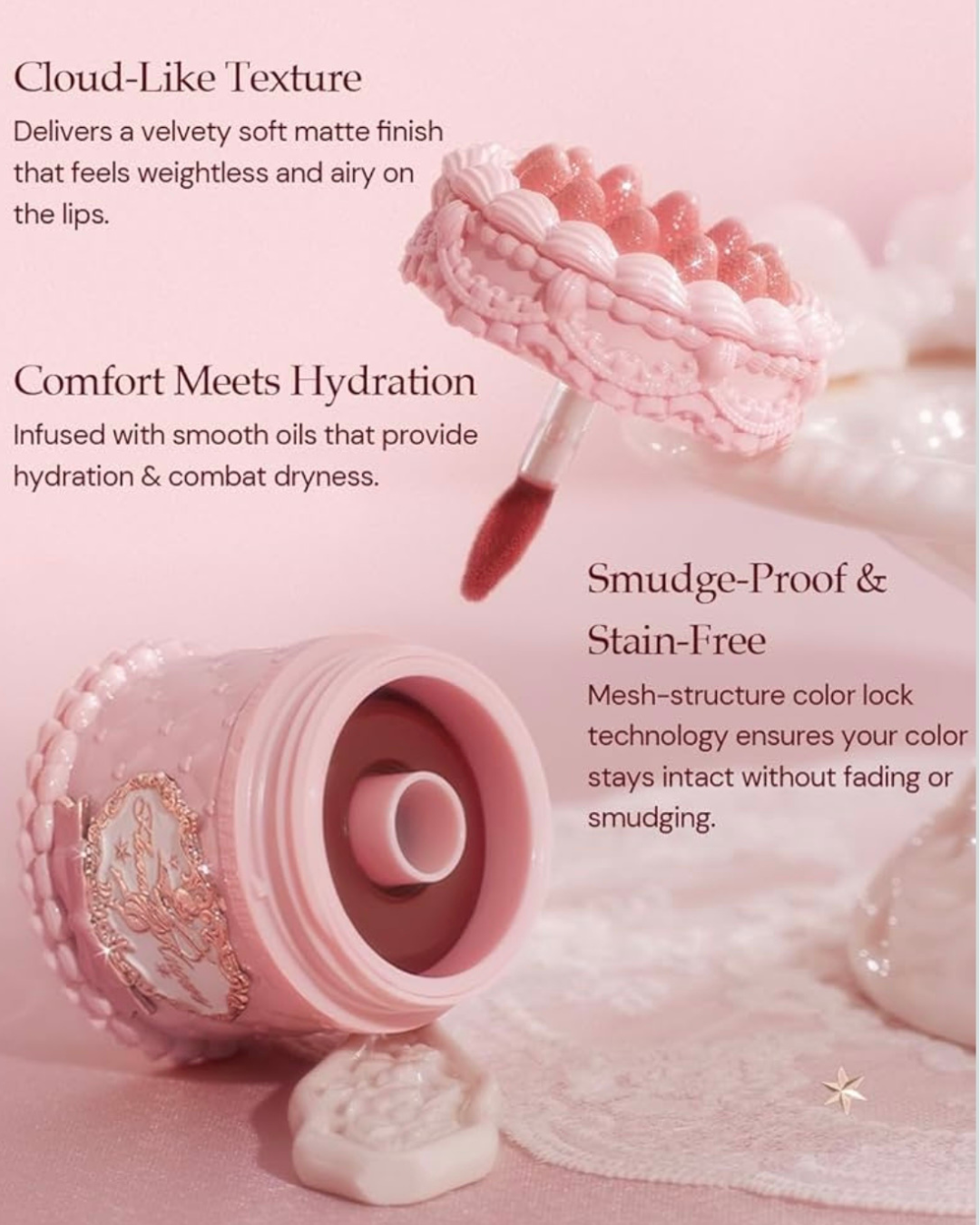 Kjo kuti e vogël balsami për buzët, e dizajnuar për t'i ngjarë një torte me krem dhe luleshtrydhe, përmban nuanca të frymëzuara nga ëmbëlsirat me një përfundim mat të butë. Ajo jep një pamje të lëmuar dhe të 'blurry' për një elegancë pa mundim.